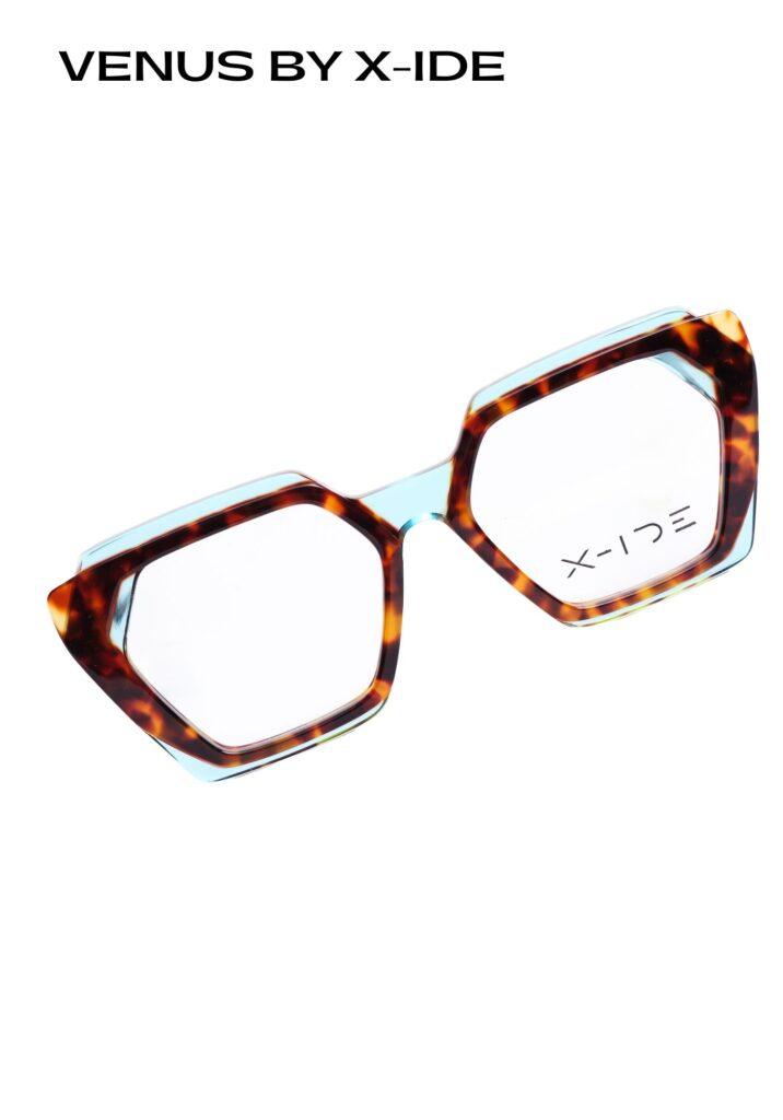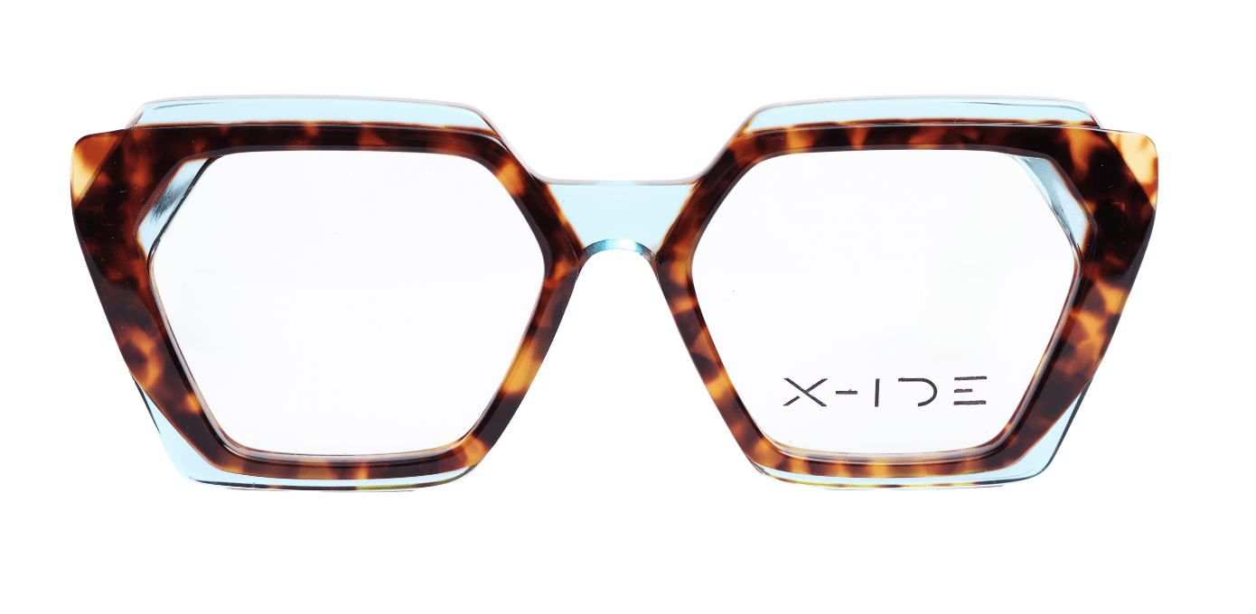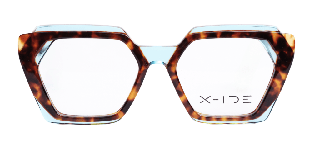 Immagine98 showcases models with striking color and pattern contrasts. VENUS by X-ide stands out with its wide, slightly elongated butterfly shape, embellished by a graphic interplay of tortoiseshell and blue. A bold accessory with an artistic touch.
