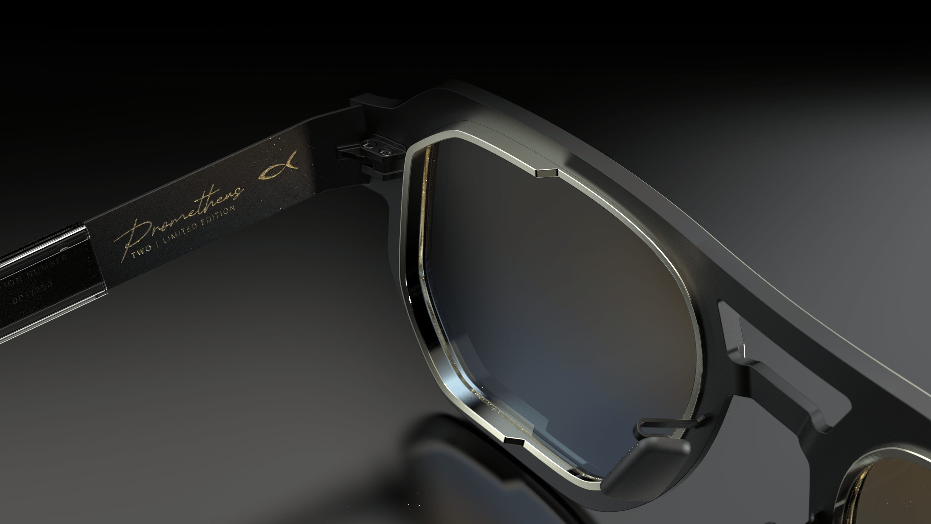 Milled with obsessive precision from a single solid block of titanium, Prometheus Two features sculpted profiles that reveal details of exceptional refinement. The design, defined by an oversized double bridge inspired by 1970s eyewear, ushers in a newly engineered rim design milled from a block of aluminum. Its lateral spoiler emerges from the inner structure of the frame, lending a distinctive sport-luxury attitude. The aesthetic is further elevated by two-tone gradient lenses and a hand-polished top bar finished with PVD using advanced Nano-Plating technology. Transparent grey acetate temple tips reveal the titanium core within, emphasizing the frame’s technical sophistication.