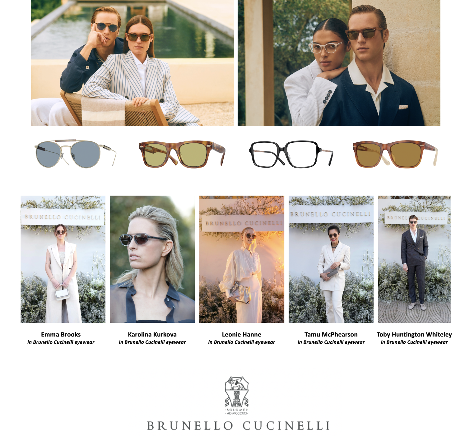 The launch includes four main collections. “Multmaterico” encompasses seven models that combine metal, acetate, innovation, and tradition in a perfect blend of style and impeccable workmanship. Inspired by Brunello Cucinelli’s high jewelry collections, the “Trama” designs celebrate the elegance and taste of the Brunello Cucinelli woman, featuring feminine silhouettes. Iconic and exquisitely refined, the “Stemma” collection embodies the highest manufacturing expertise in the eyewear world with embedded cores, riveted hinges, and functional metal elements that are entirely custom-made, and inspired by the coat of arms of the medieval village where the Brunello Cucinelli brand established its roots. The “Pattern” frames highlight the craftsmanship and meticulous detailing of Brunello Cucinelli’s handmade creations and the unmistakable pattern inspired by Solomeo’s coat of arms. Lastly, the Gemmae style is designed for women who embody understated elegance through sculpted acetate frames that enhance refined details through very fine constructions.