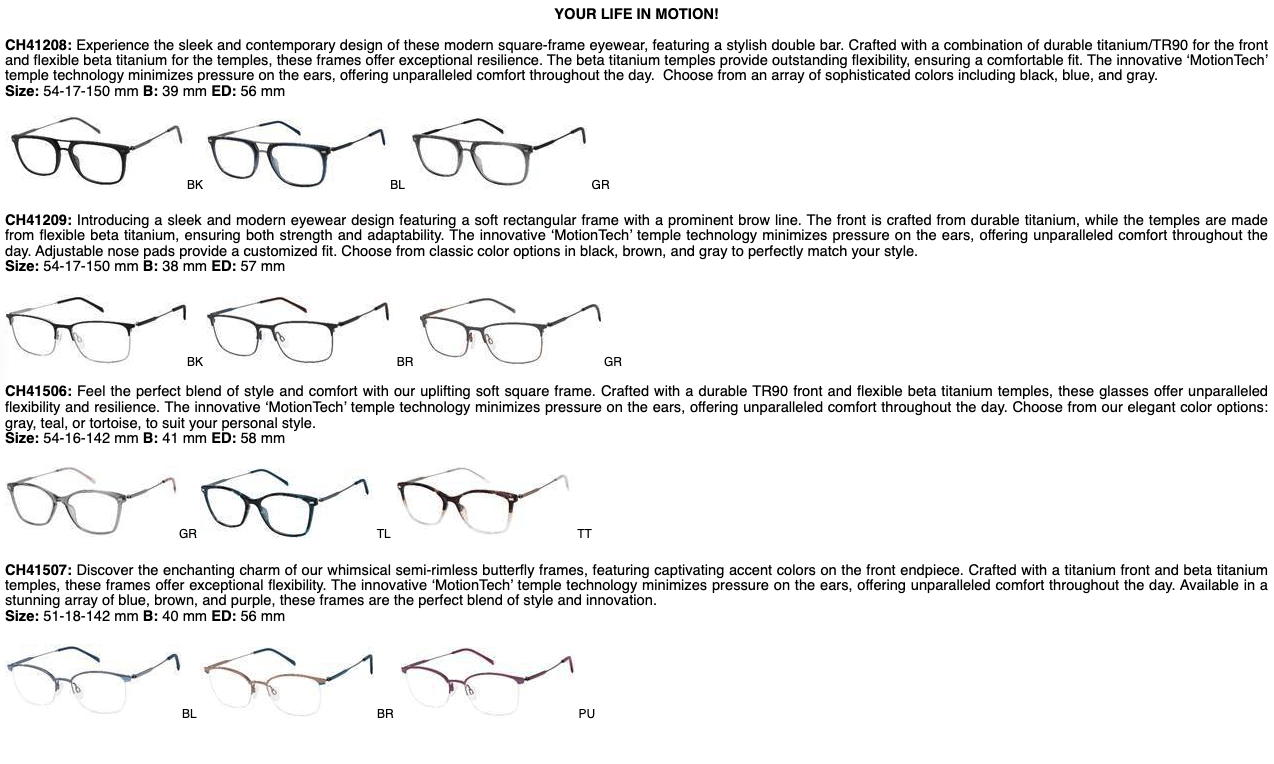 CHARMANT USA Inc., established in 1982, is a top eyewear manufacturer, designer, and distributor, offering US-specific styles from house and license brands. CHARMANT’s commitment to quality manufacturing remains unsurpassed, producing attractive and comfortable frames. CHARMANT USA Inc. was awarded ELLE’s Best Marketing Activation in 2023. CHARMANT USA Inc. products can be seen in top eyewear magazines and online press. Nominated in the 2025 NOW Trend Showcase at Vision Expo East in four categories, including sensorial design, innovation, memories are made of, and consciously designed. CHARMANT was selected as 2025 Ultimate Partner in Jobson’s Vision Monday Magazine and 20/20 Magazine reader survey. CHARMANT exclusively took on the design, development, and distribution of optical frames and sunglasses for premium sports brand HEAD. Whether your patient is looking for trendy or classic, bold, or subtle – you’ll find a wide assortment of superior frames your patients can rely on. The variety of brands CHARMANT USA Inc. carries include Line Art CHARMANT, CHARMANT Japanese Made, CHARMANT Titanium Perfection, Minamoto, Aristar, ELLE, HEAD, Isaac Mizrahi New York, and Eddie Bauer.
