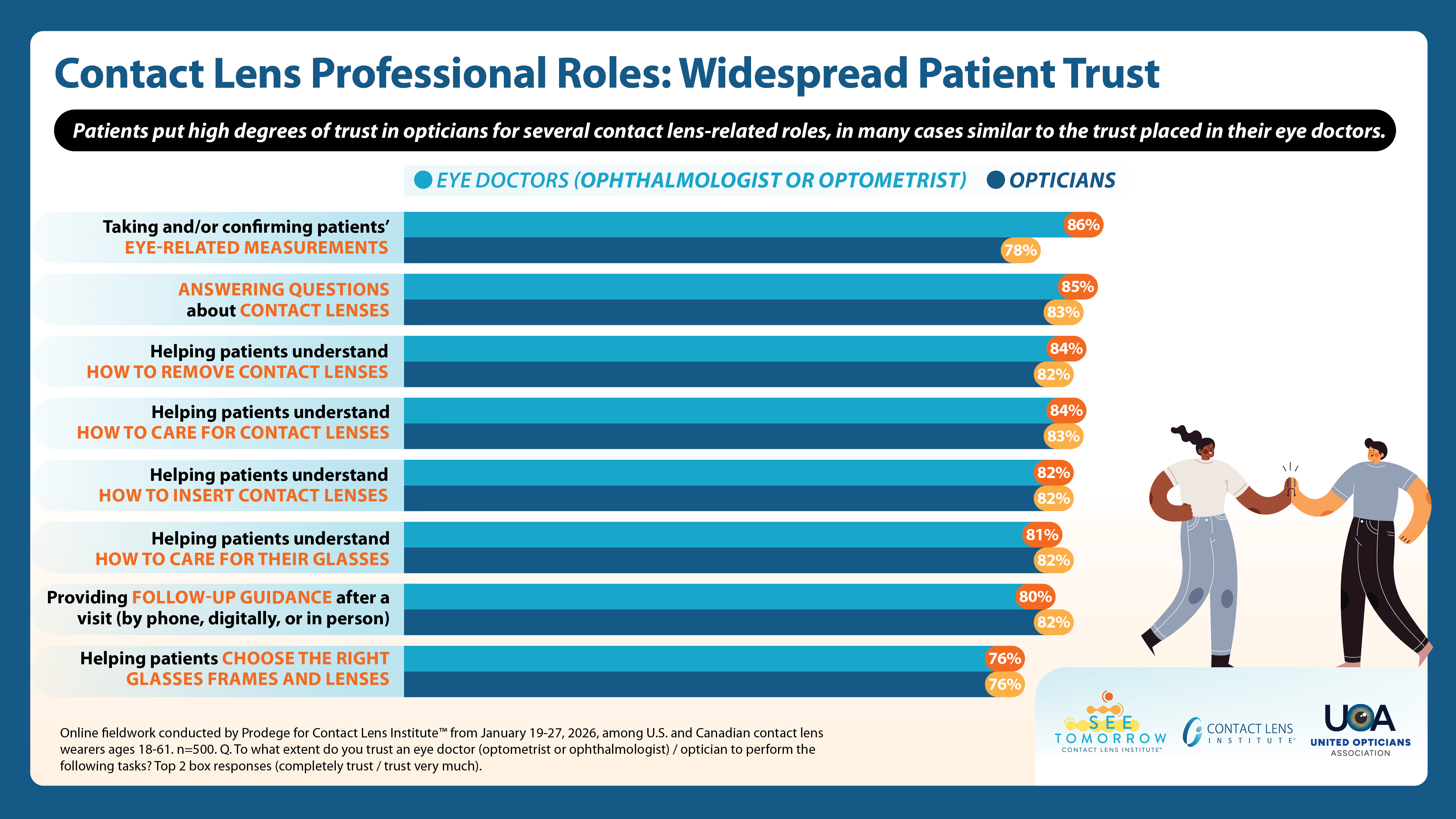 Of particular note is patient trust in opticians’ performance of contact lens education and related tasks: results were above 80% across the board, on par with how consumers scored ophthalmologists and optometrists.