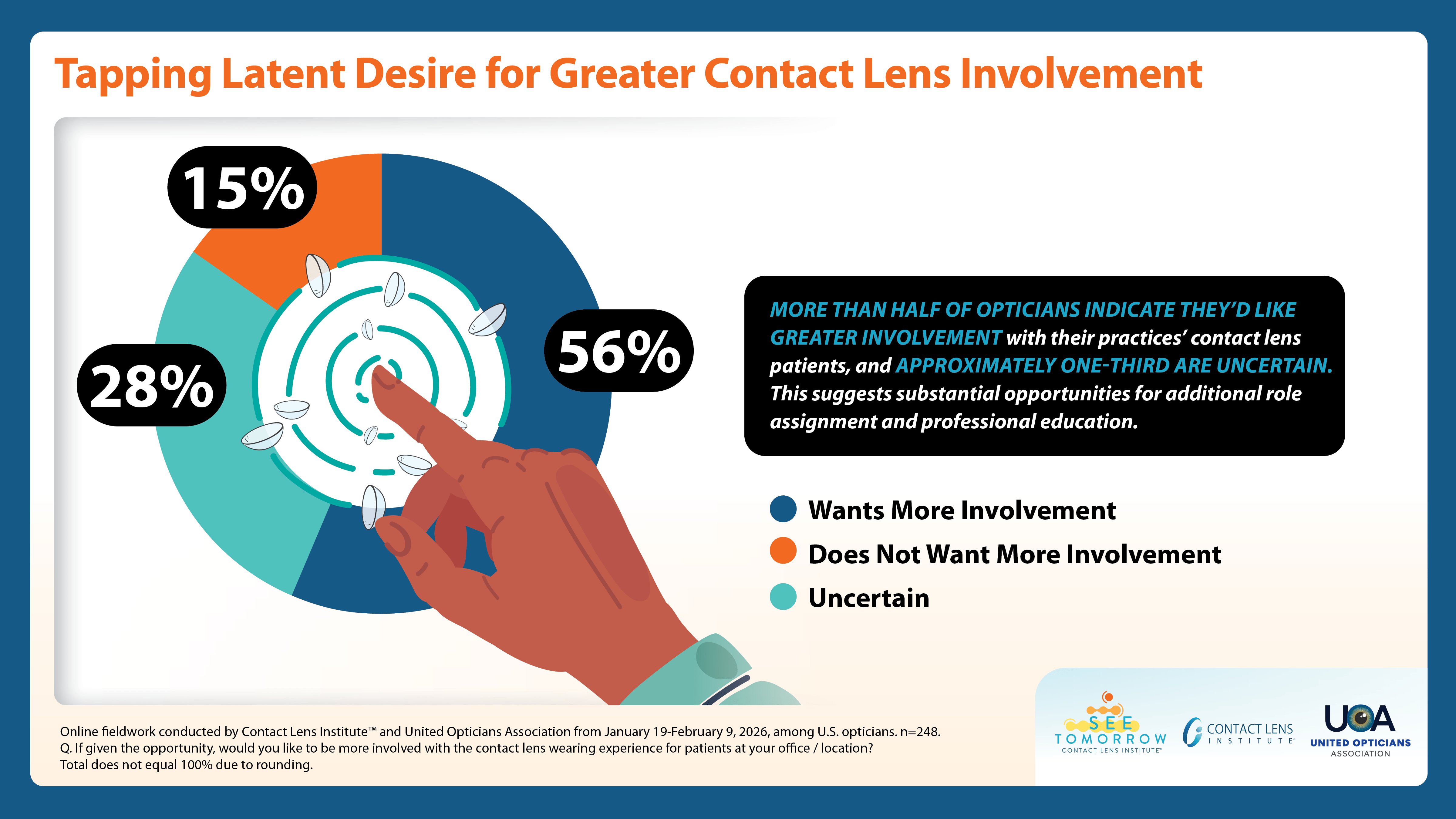 Greater professional education may prove valuable. About half of opticians (48%) say their knowledge of contact lenses is the same as spectacle frames and lenses, although 38% report they know moderately or significantly less. And when given the opportunity, 56% say they would like to be more involved in the contact lens patient wearing experience, yet 28% say they are uncertain.