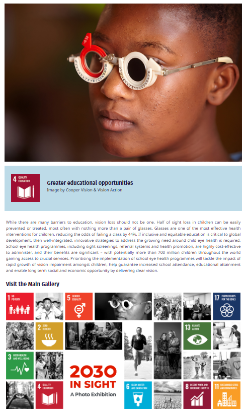 • United Nations Photo Exhibition. As a Global Patron of the International Agency for the Prevention of Blindness, CooperVision joined forces with the organization for the 2030 IN SIGHT photo exhibition at the United Nations headquarters in New York from October 9-20. Submissions, including one from CooperVison and Vision Action from their work screening children in Ghana, challenge viewers to consider the impact of eye health on sustainable development outcomes. You can preview the exhibition, including a submission, by visiting the exhibit website or through the attached booklet.