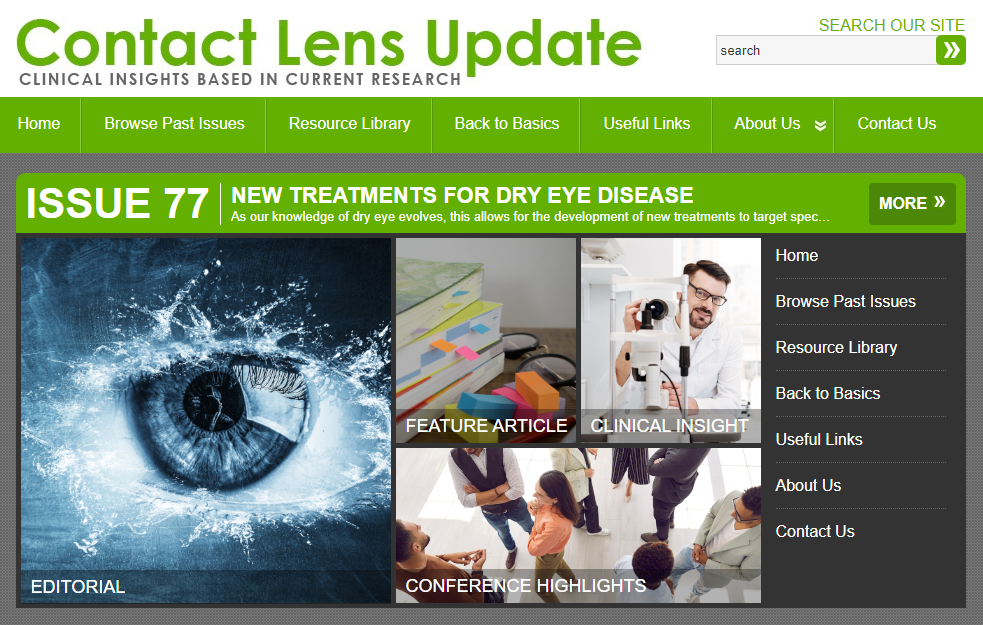 In addition to a complete archive of back issuesContactLensUpdate.com offers a resource library that provides no-cost professional tools, patient resources, images and video. It also houses complimentary technical training videos produced by International Association of Contact Lens Educators, plus an industry glossary. Industry professionals can access the latest issue directly from ContactLensUpdate.com or quickly sign up for email receipt of future issues.