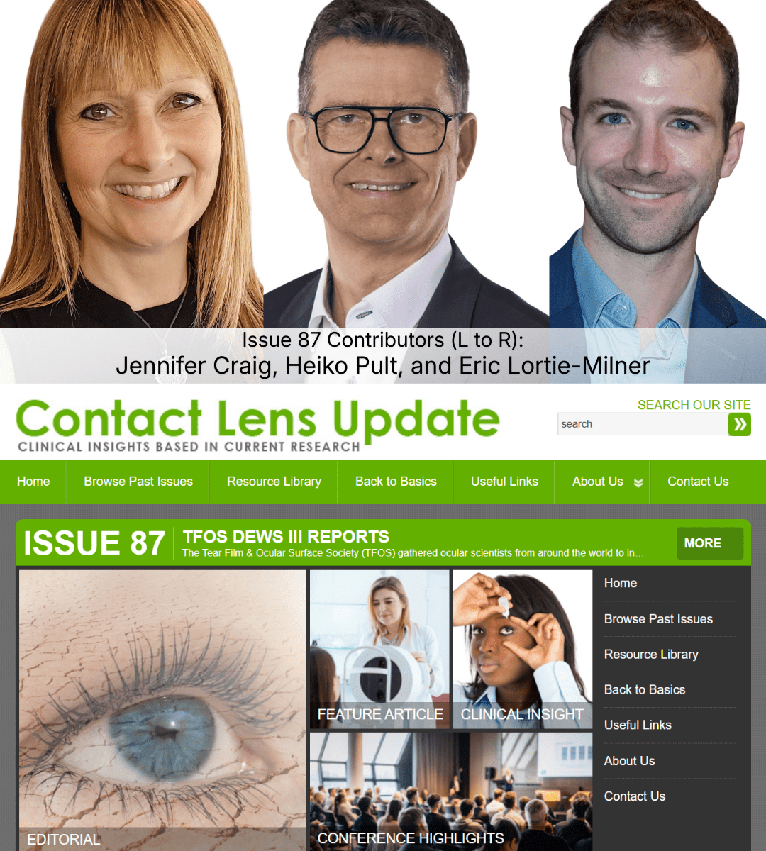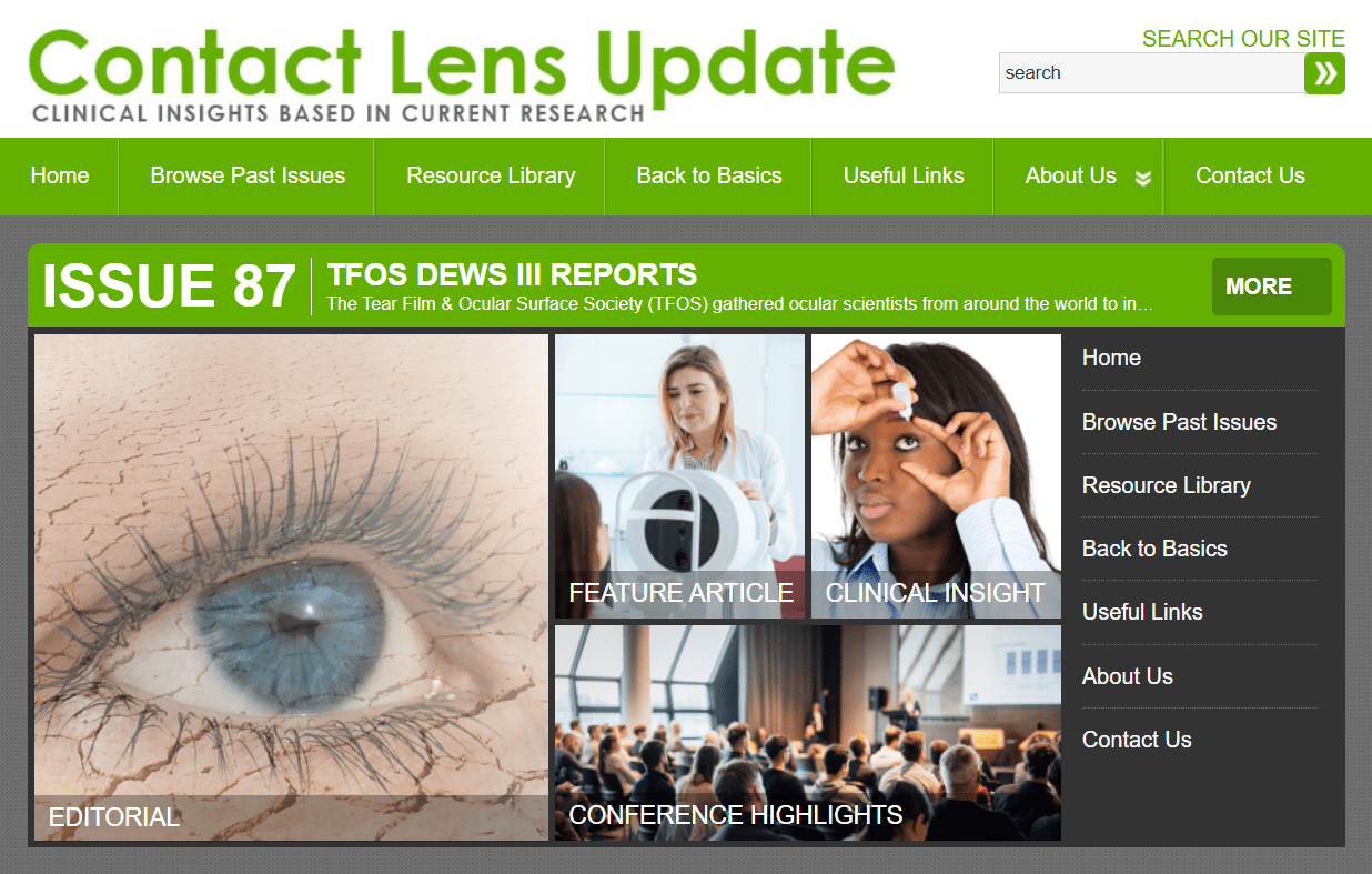 In addition to a complete archive of back issues, ContactLensUpdate.com offers a resource library that provides no-cost professional tools, patient resources, images and video. It also houses complimentary technical training videos produced by International Association of Contact Lens Educators, plus an industry glossary. Industry professionals can access the latest issue directly from ContactLensUpdate.com or quickly sign up for email receipt of future issues.