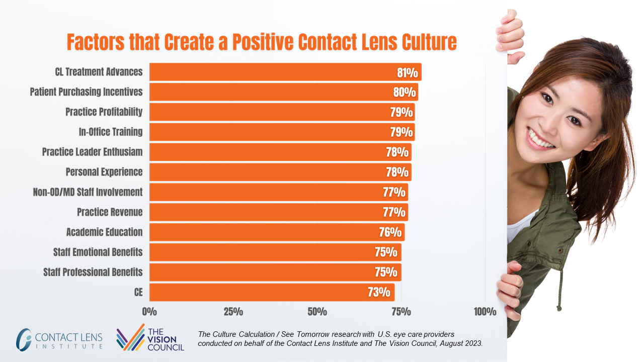 The research team also asked the eye care community to rate the importance of more than 20 factors that affect a positive contact lens culture. Product access and advancements topped the list, followed closely by elements over which a practice has more direct control, including education and training, in-office advocacy, and the emotional and professional benefits staff receive by prescribing contact lenses.
