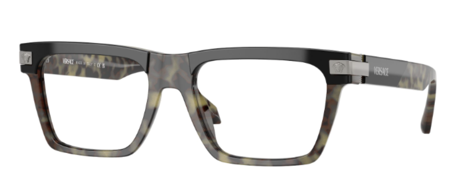 Squared optical shape made from recycled acetate with double-layered construction in color contrast, visible both on the frame front and temples, and metal hinges with wraparound Medusa head plaques. Available in light Havana with black top or Havana blue with black top.