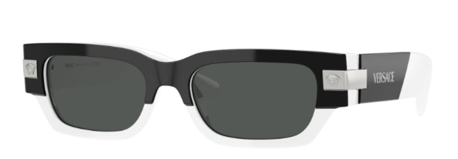 Narrow rectangular shape with streamlined contours and flat-top profile, metal wraparound Medusa head plaque decoration, and double-layer construction in recycled acetate. Available in Havana with black top and white with black top, both featuring dark gray lenses.