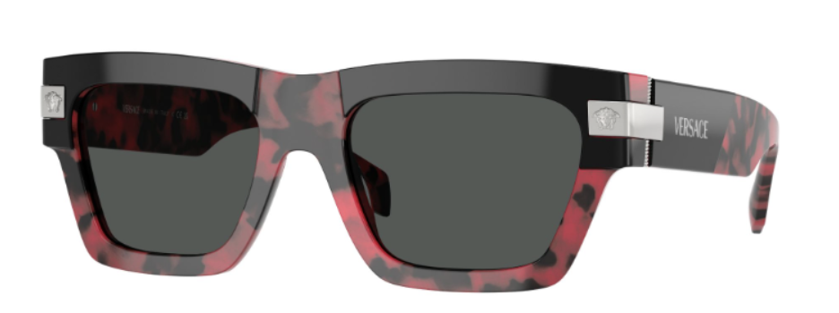 Flat-top rectangular sunglasses with double-layer construction in recycled acetate and distinctive metal hinges on the temples and the signature Medusa head decoration. Available in colors including Havana red with black top and Havana blue with black top, both with dark gray lenses.