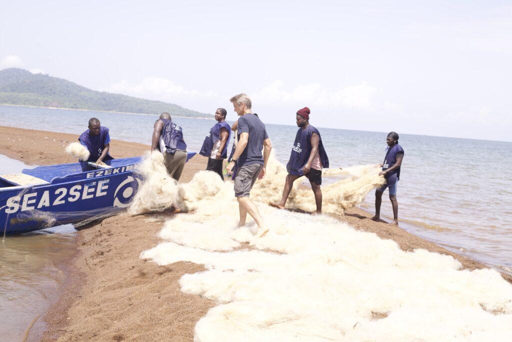 Van den Abeele visited Lake Volta and Mpando, a Sea2see collection hub where discarded fishing nets from nearby islands are brought and then cleaned in preparation for recycling. This stage of manual cleaning is critical, as it ensures the removal of even the smallest traces of waste that could otherwise compromise subsequent processing.