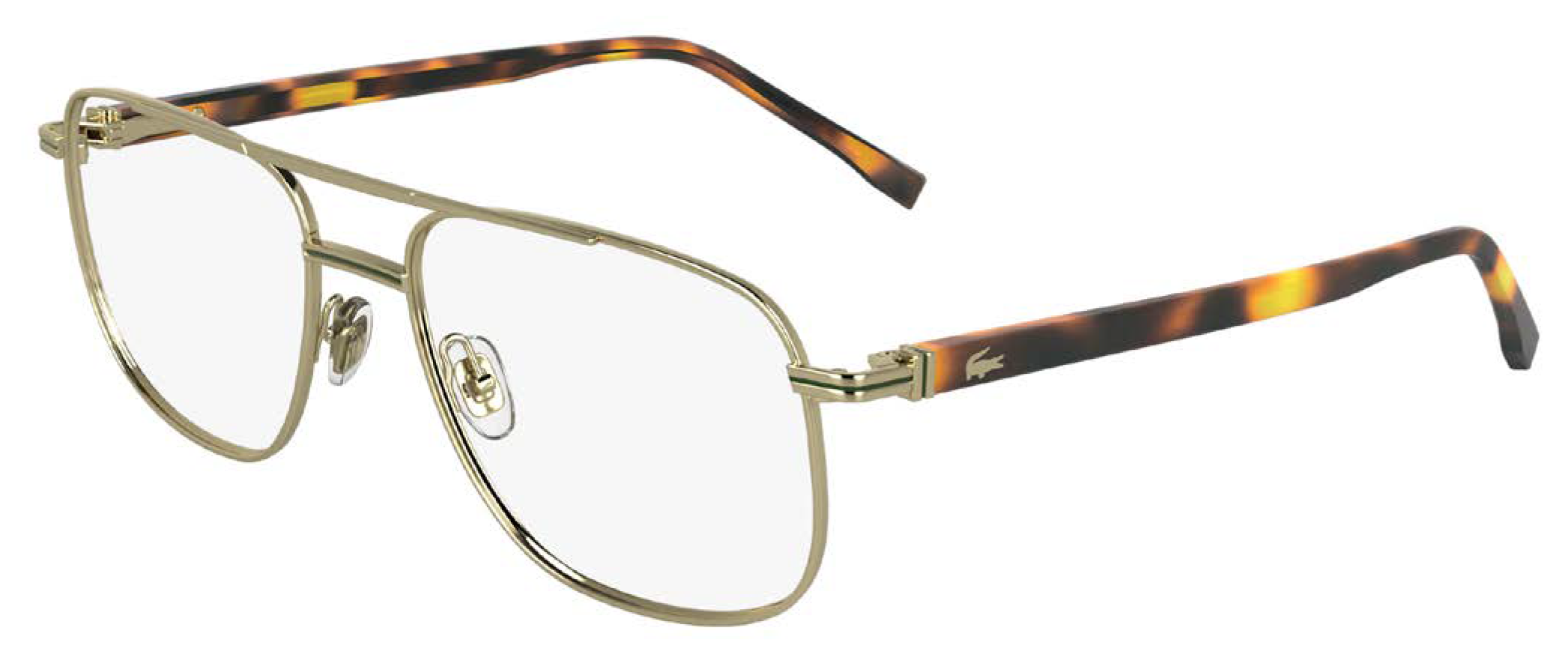 The metal navigator front of this optical frame for men features a double bridge for a sophisticated, vintage-inspired look. The bridge, end pieces, and acetate temples feature a green enamel line that recalls the Lacoste iconic Ribbon, while a metal Croc is placed on the temples to complete the look. Part of The Line collection, this style is featured in Gold in the Fall/Winter 24 advertising campaign but is also available in Matte Black and Silver.