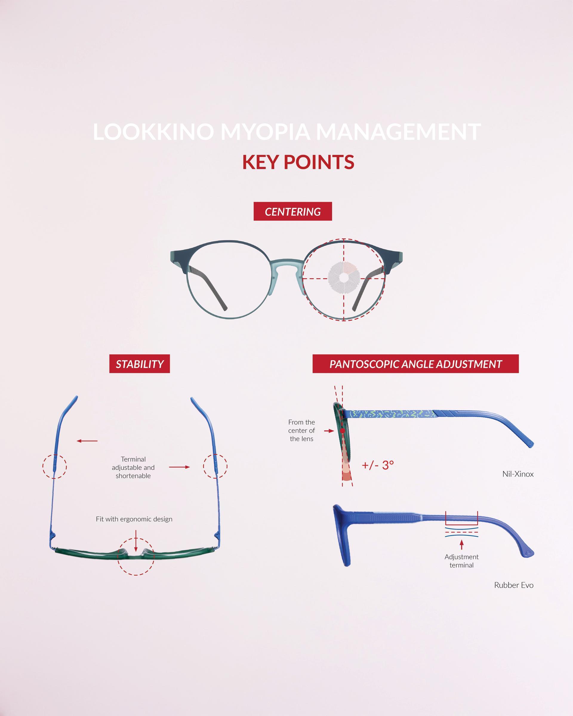 The Lookkino Myopia Management project stems precisely from this awareness: to support the visual health of children with frames that abide by three core characteristics required of all manufacturers of myopia lenses. First, precise centering of the lens with respect to the pupil to ensure the effectiveness of the myopia lens in its functional optical zone; second, absolute stability in the three points of support (nose, right ear and left ear) to avoid micro-movements that could compromise corrective function; third, adjustment of the pantoscopic angle, to adapt the inclination of the lens to the child’s posture and facial physiognomy.