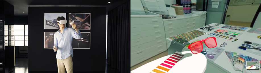 Once worn, the headset offers an immersive experience in the Longarone headquarters where the user can go through all of the production spaces, from the creative process to prototyping, followed by manufacturing steps, and ending with the product distribution. The journey ends with a virtual visit at an optician’s store, where it is possible to admire the final products. This experience is even more engaging thanks to the possibility of interacting with the 3D objects present in each environment, looking at them closely and touching extraordinary pieces from the collections, appreciating the craftsmanship of the design details or production phases, and observing in detail the eyewear manufacturing process.