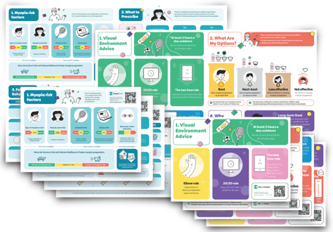 These bold, engaging infographics serve as a chairside reference guide for ECPs, detailing myopia risk factors, prescribing guidelines, follow-up schedules, and success metrics. Additionally, they aid in communicating key topics to parents and patients, such as visual environmental advice, treatment options, the suitability of contact lenses for children, and the importance of myopia management.
