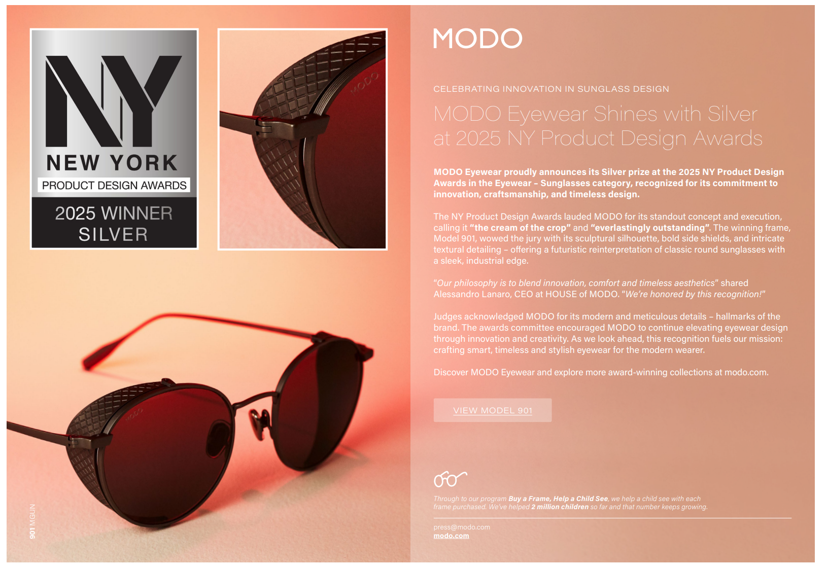 MODO Eyewear proudly announces its Silver prize at the 2025 NY Product Design Awards in the Eyewear – Sunglasses category, recognized for its commitment to innovation, craftsmanship, and timeless design.