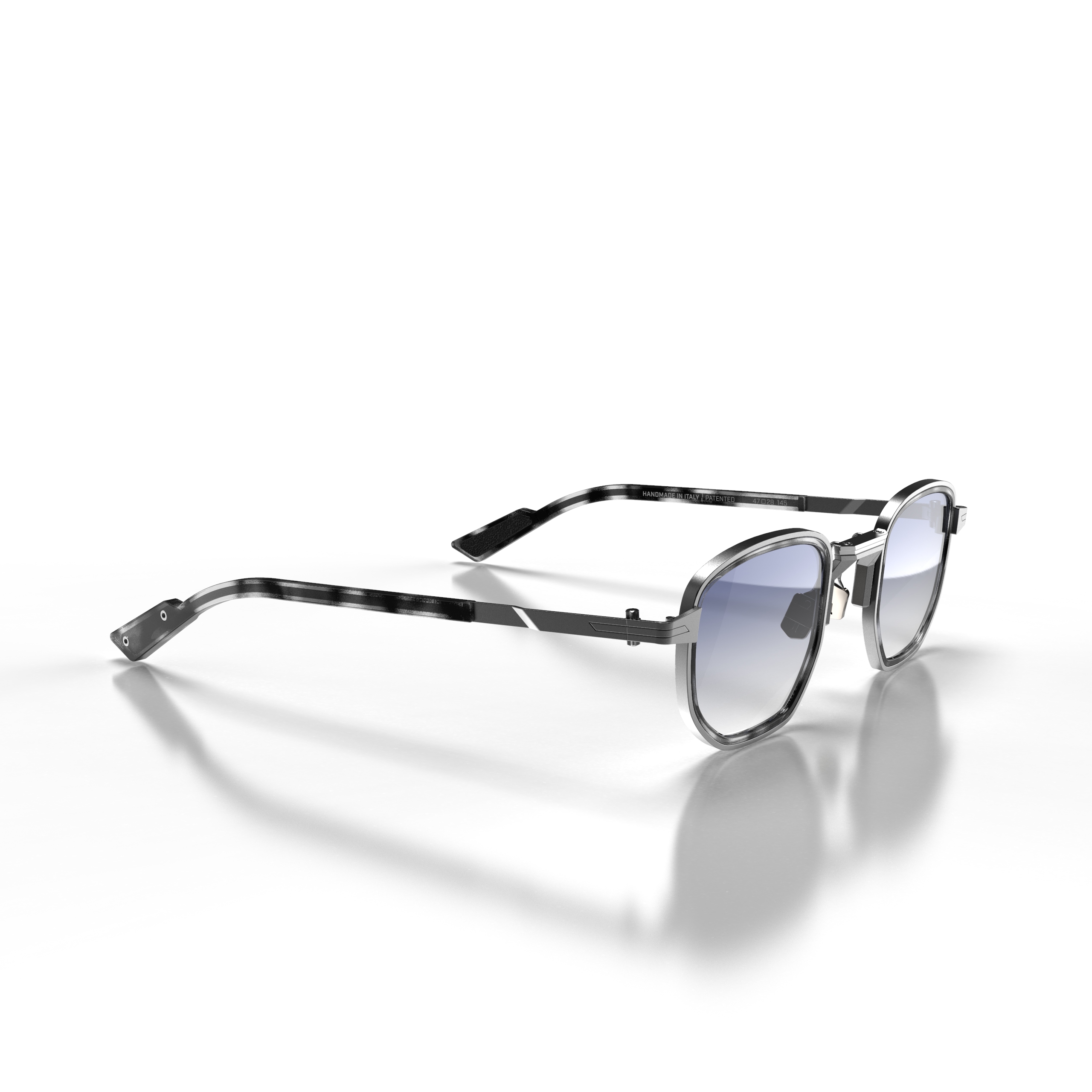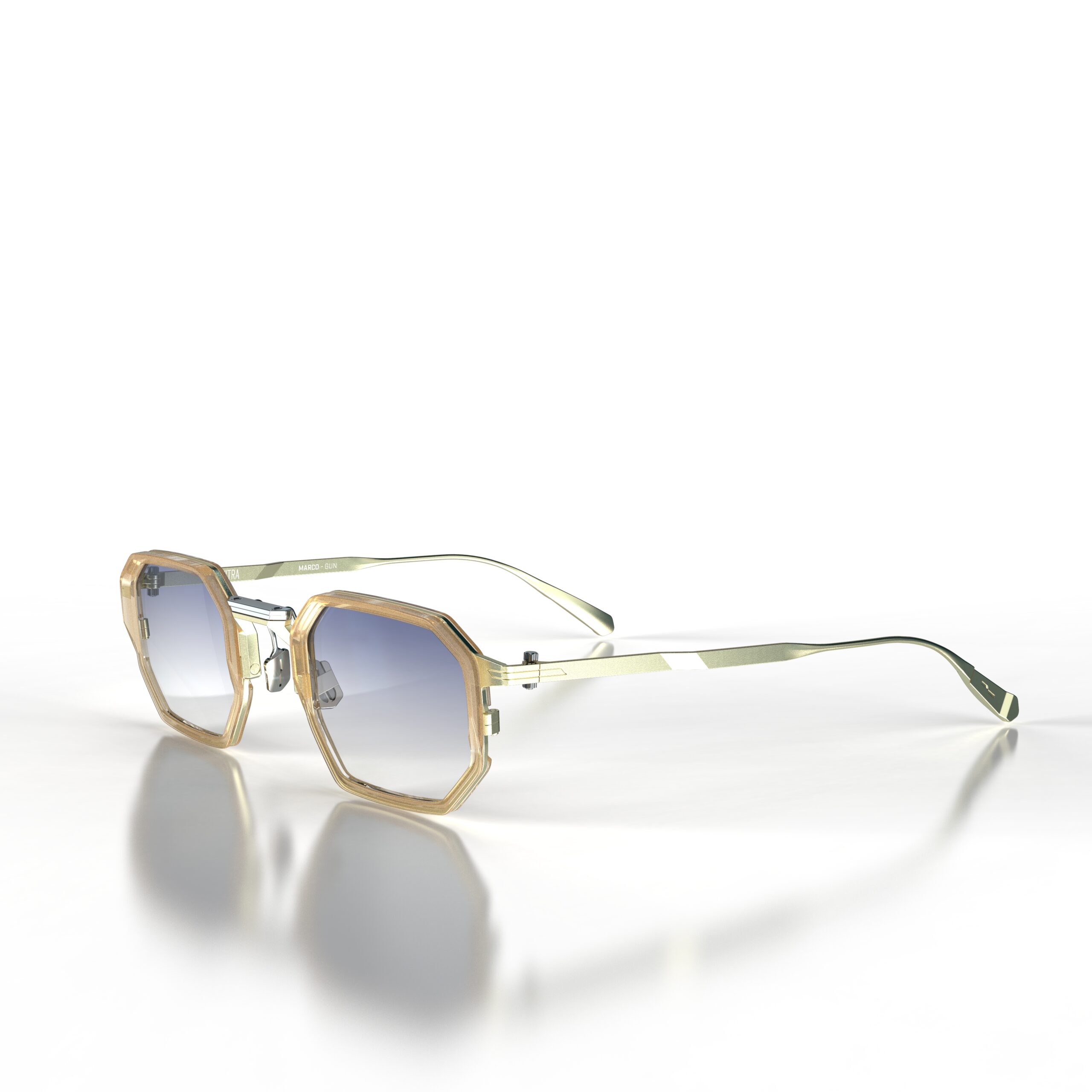 Model MARCO is a geometric design, featuring a slick combination of acetate, titanium and stainless steel. The frame features the innovative galvanic finishing with colourways of Gun Metal/light gun with Crystal Black and Flash Electric Gradient lenses and Gold/light gun with Crystal Sand acetate and Flash Electric Gradient Light Blue lenses.