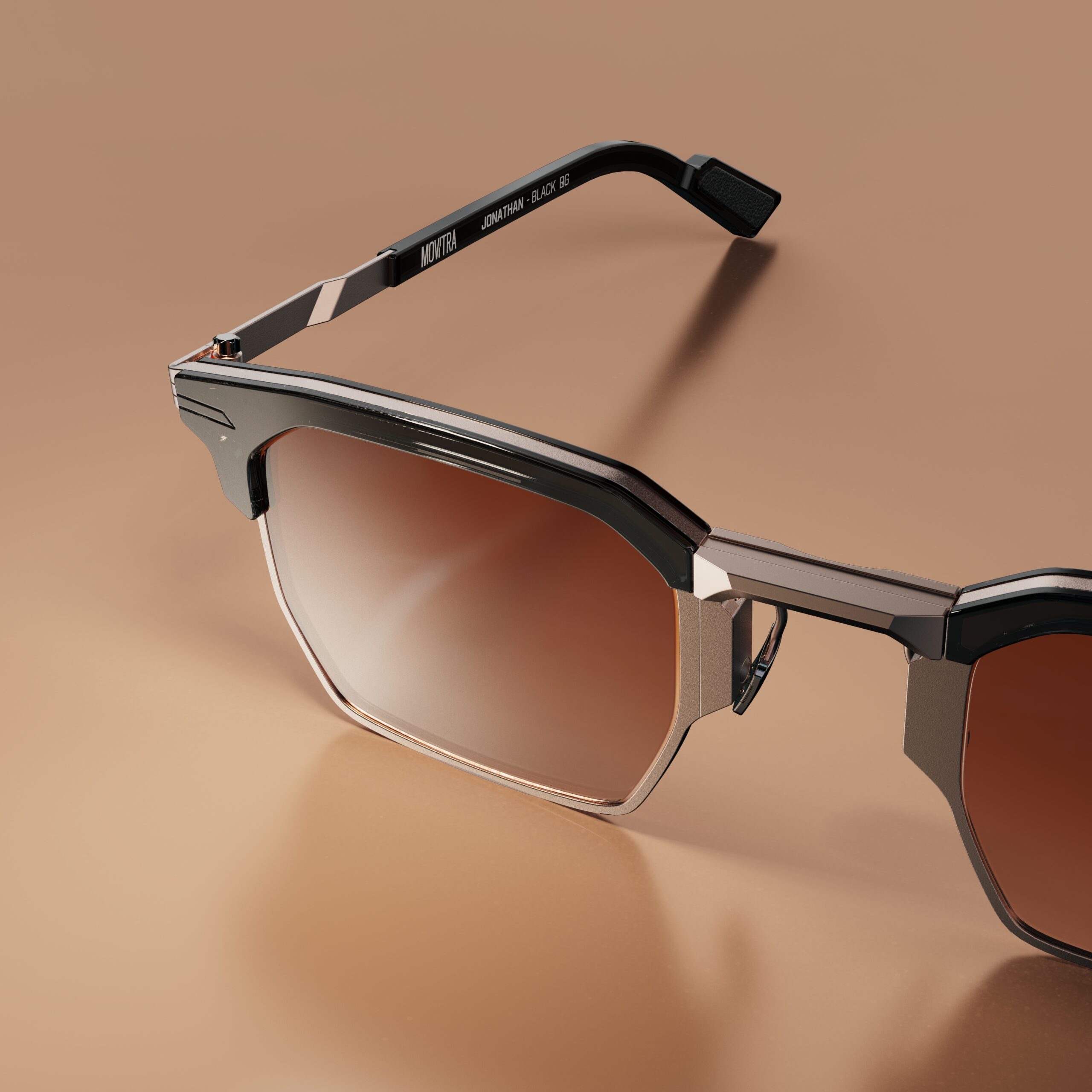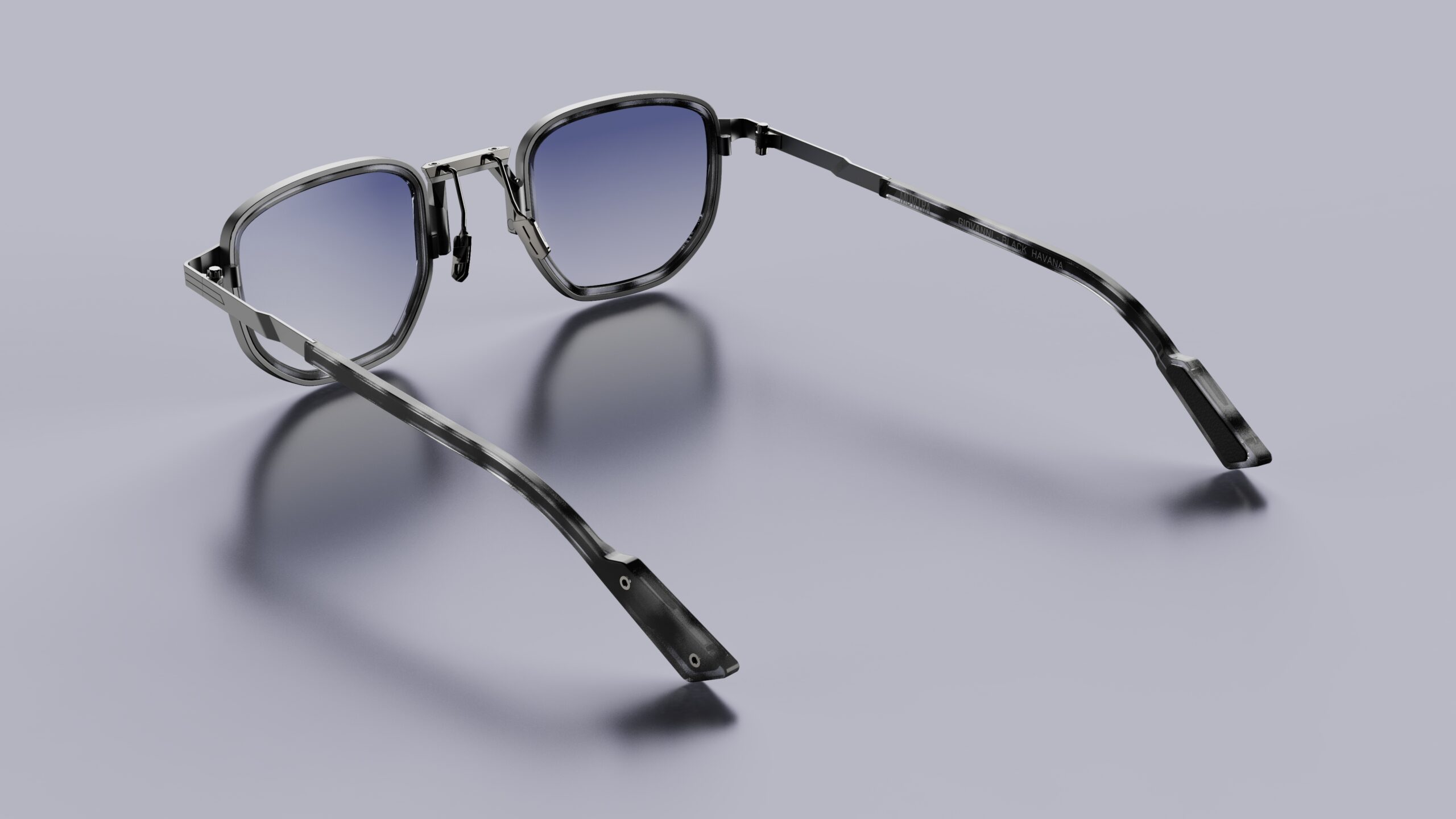 Model JONATHAN is based on the classic 1950s browline eyewear shape. The frame, which is produced in acetate, titanium and stainless steel., is reinterpreted with a very modern finish, thanks to a galvanic finishing and cool colourways such as Gun Metal with Crystal Black acetate + Flash Electric Blue lenses or Rose Gold with Crystal Black acetate and Flash Electric Gradient Brown lenses. The bridge features an insert with a contrasting finish.