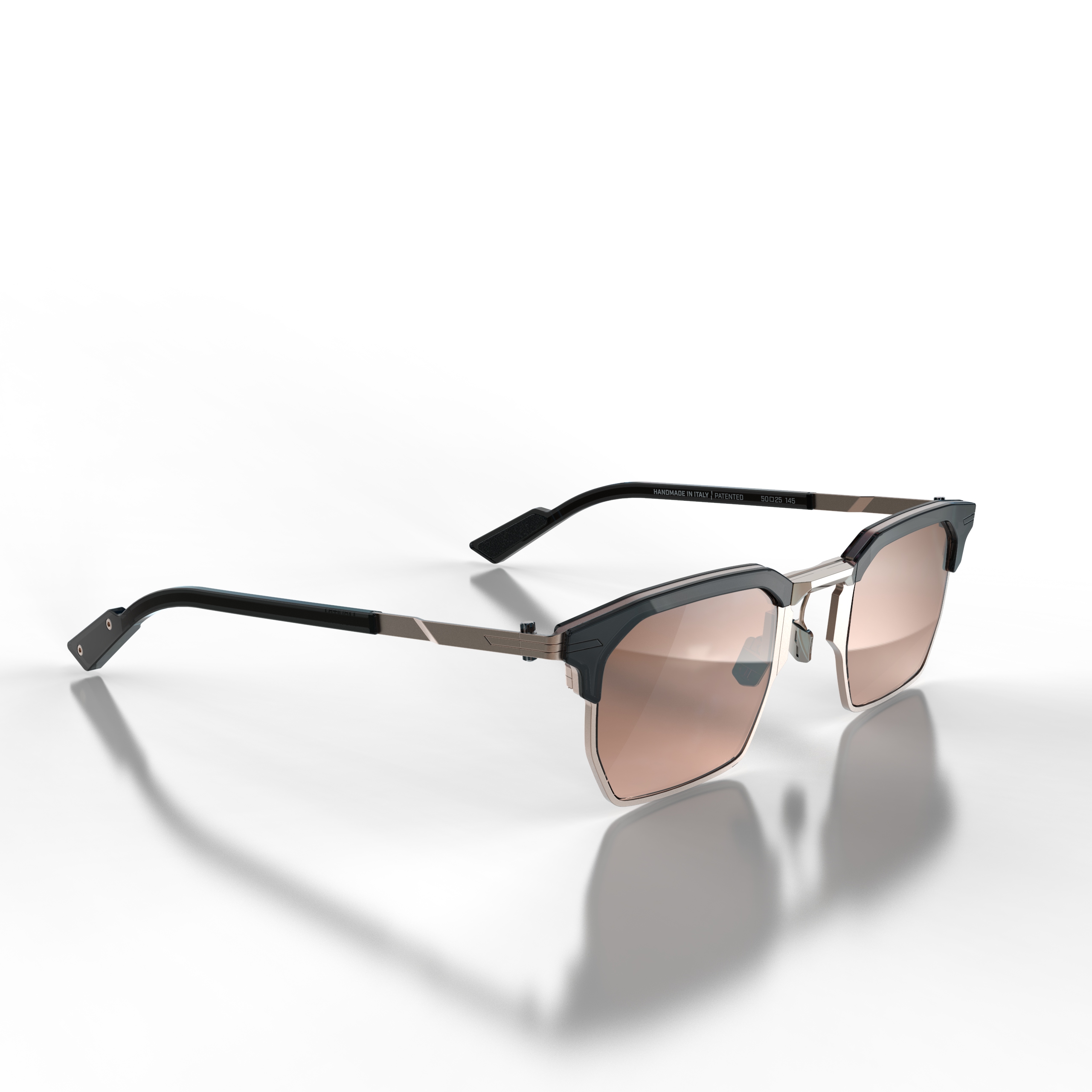 Part of the Combo Collection, Model GIOVANNI offers a smart, slightly softened square eye shape, in acetate, titanium and stainless steel. The frame comes in Black Havana acetate with galvanic finishing in Gun Metal and Light Gun and a Flash Electric Gradient Light Blue sun lens or Havana acetate with galvanic finishing in Gun Metal and Light Gun with Green lenses. The frame also has the new bridge design, created from a mould and an integrated mechanism and insert with double galvanic finish on the upper section.