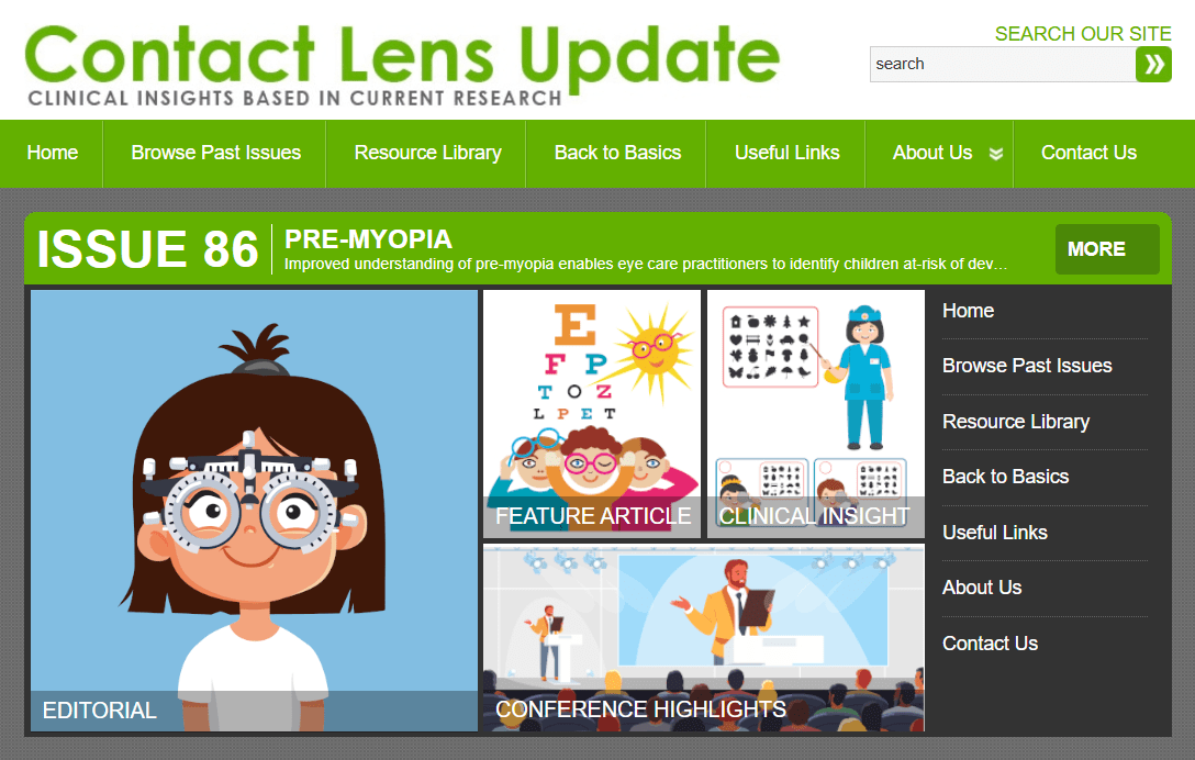 In addition to a complete archive of back issues, ContactLensUpdate.com offers a resource library that provides no-cost professional tools, patient resources, images and video. It also houses complimentary technical training videos produced by International Association of Contact Lens Educators, plus an industry glossary. Industry professionals can access the latest issue directly from ContactLensUpdate.com or quickly sign up for email receipt of future issues.