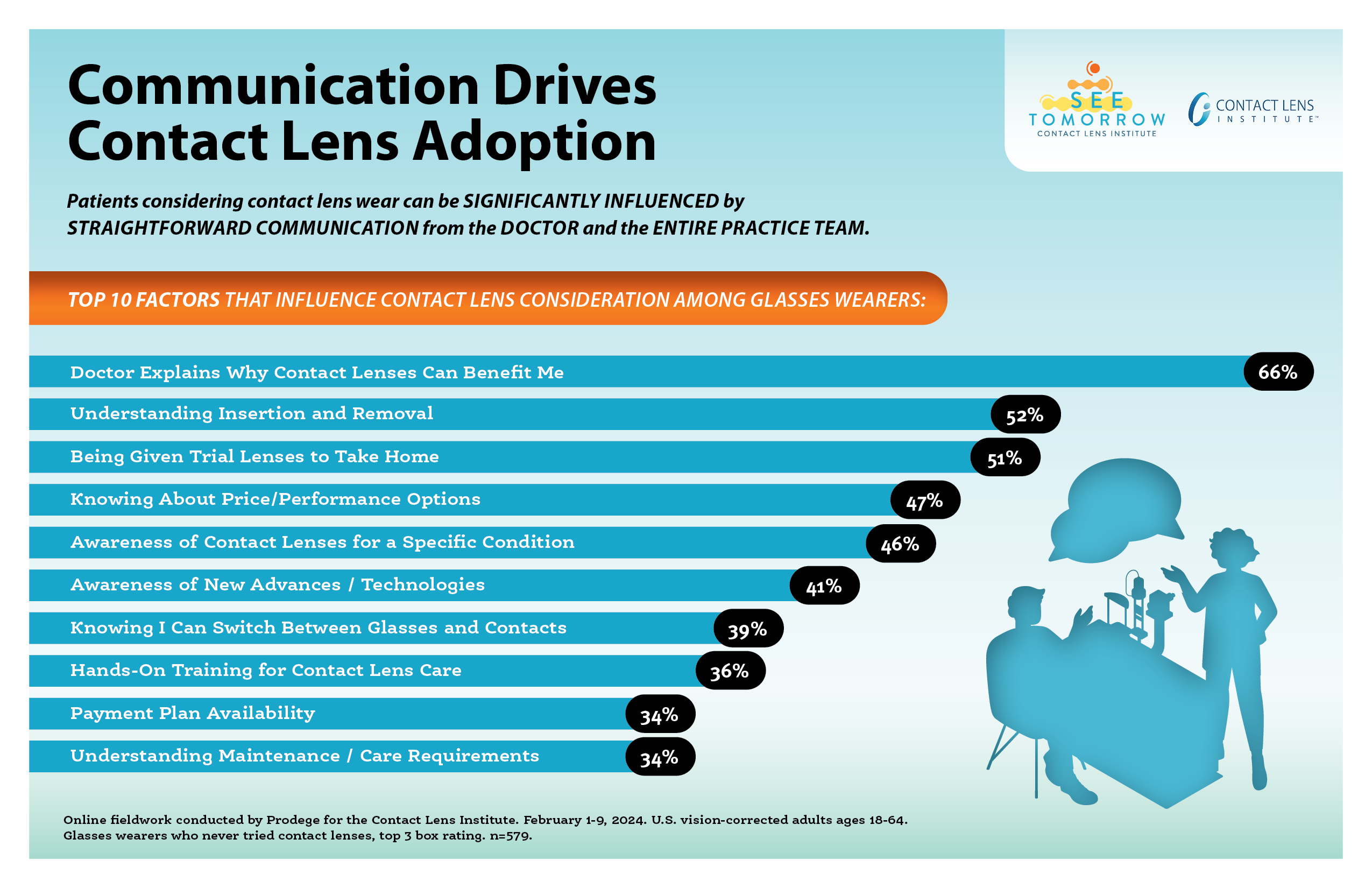 The same respondents were also asked to weigh 25 factors that would influence their consideration of contact lenses—all actions largely within the control of offices. Having their eye doctor explain why contact lenses would benefit the patient ranked first (66%), followed by understanding how to insert and remove lenses (52%), being given trial lenses at their appointment (51%), having a wide range of price and performance options (47%), and being aware of contacts for specific eye conditions (46%).