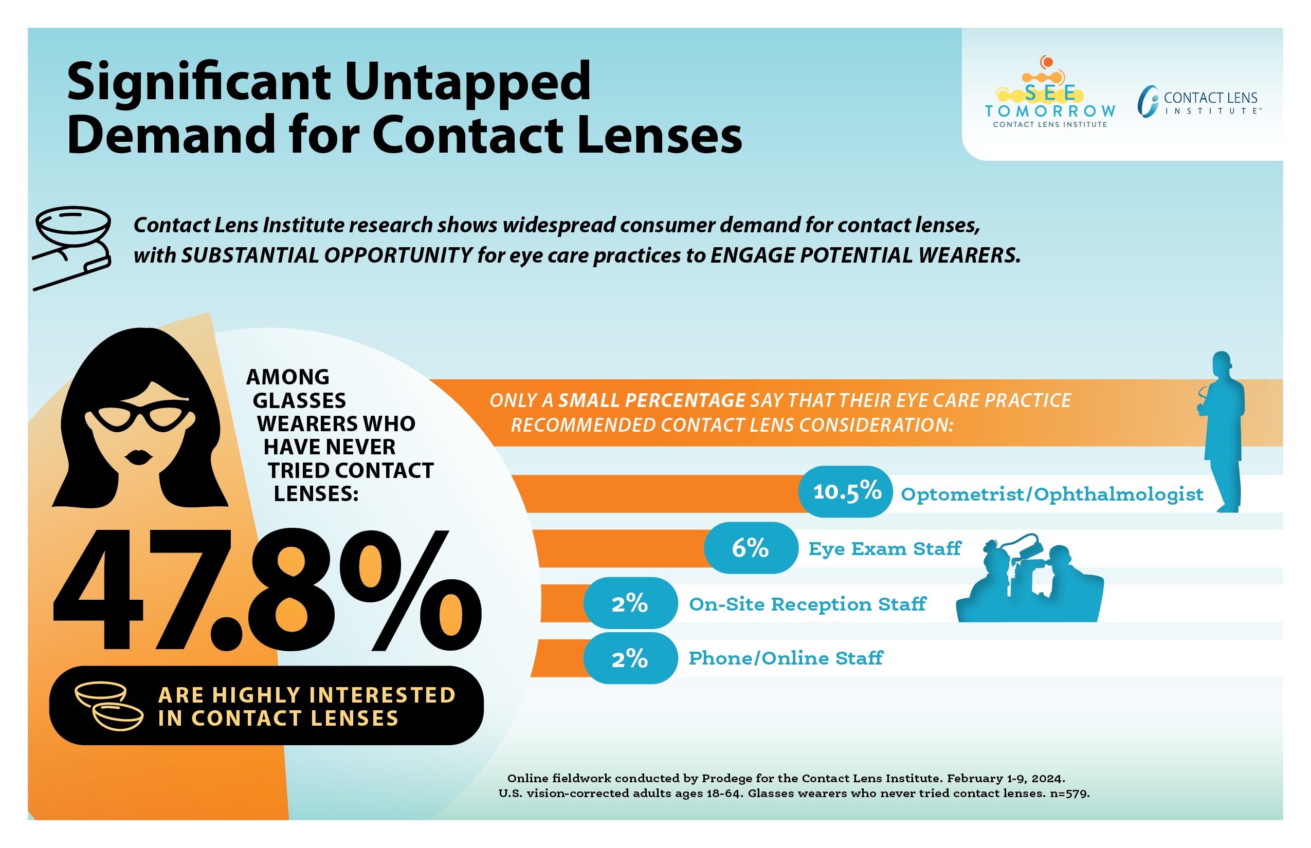 The research was commissioned by the Contact Lens Institute and conducted by Prodege from February 1-9, 2024, via an online survey. Respondents included 1,053 vision-corrected adults ages 18-64 residing in the United States. The sample size for glasses wearers who had never tried contact lenses was 579.