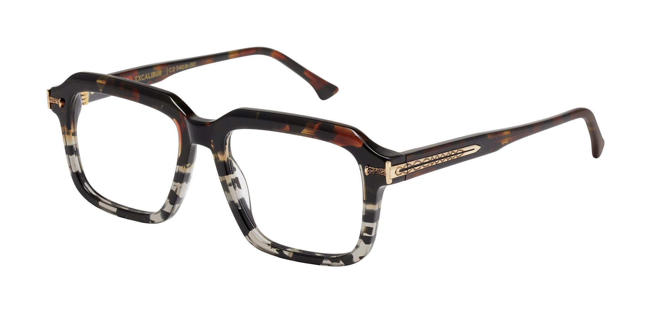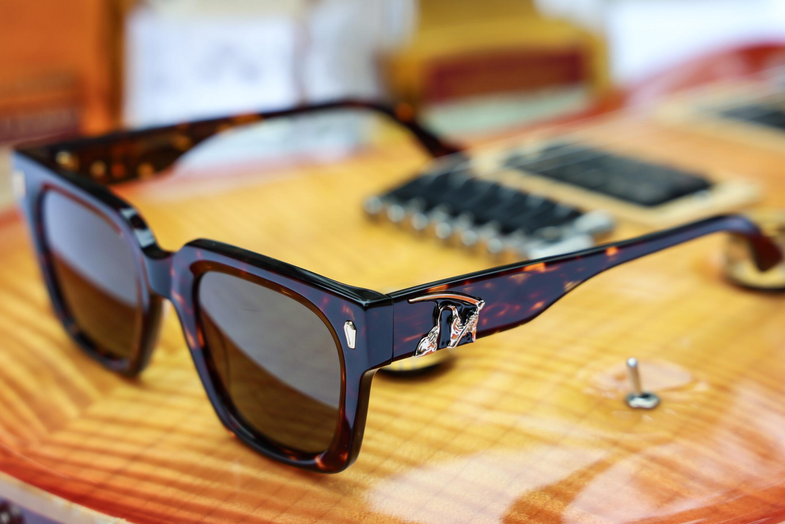 Examples of this include the sunglass “Judgement”, whose temples are beset by a shadowy hooded figure wielding a scythe. Tiny metal coffins grace the outer edges of this bold acetate square. Another is “Excalibur” sports a powerful men’s front whose temples and endpieces are beset with the architecture of this legendary blade. Not to be missed is “Viper”, a classic round metal silhouette complimented by temples that flow with the contours of a snake whose engravings are reminiscent of popular jewelry.