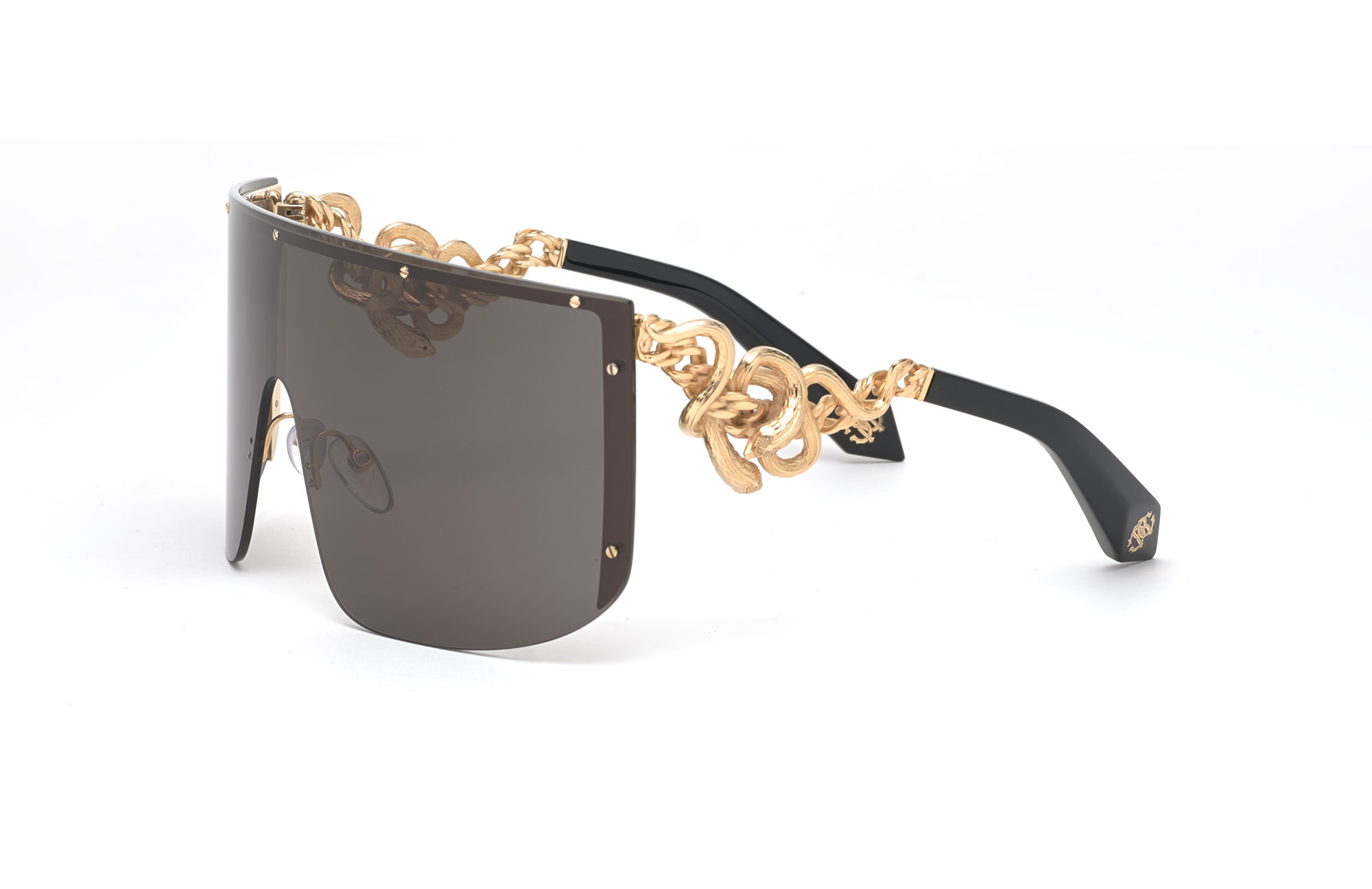 The oversized mask (SRC0015) with its wraparound front is embellished with micro studs that support a streamlined metal structure behind, available in either grey or bronze mirror. The real muse however, is the temple, which features a metal chain elegantly teased by an intertwined snake in stunning rose gold detail. This attention-getting and fashion- forward design is surely to become the one of the line’s signature pieces.