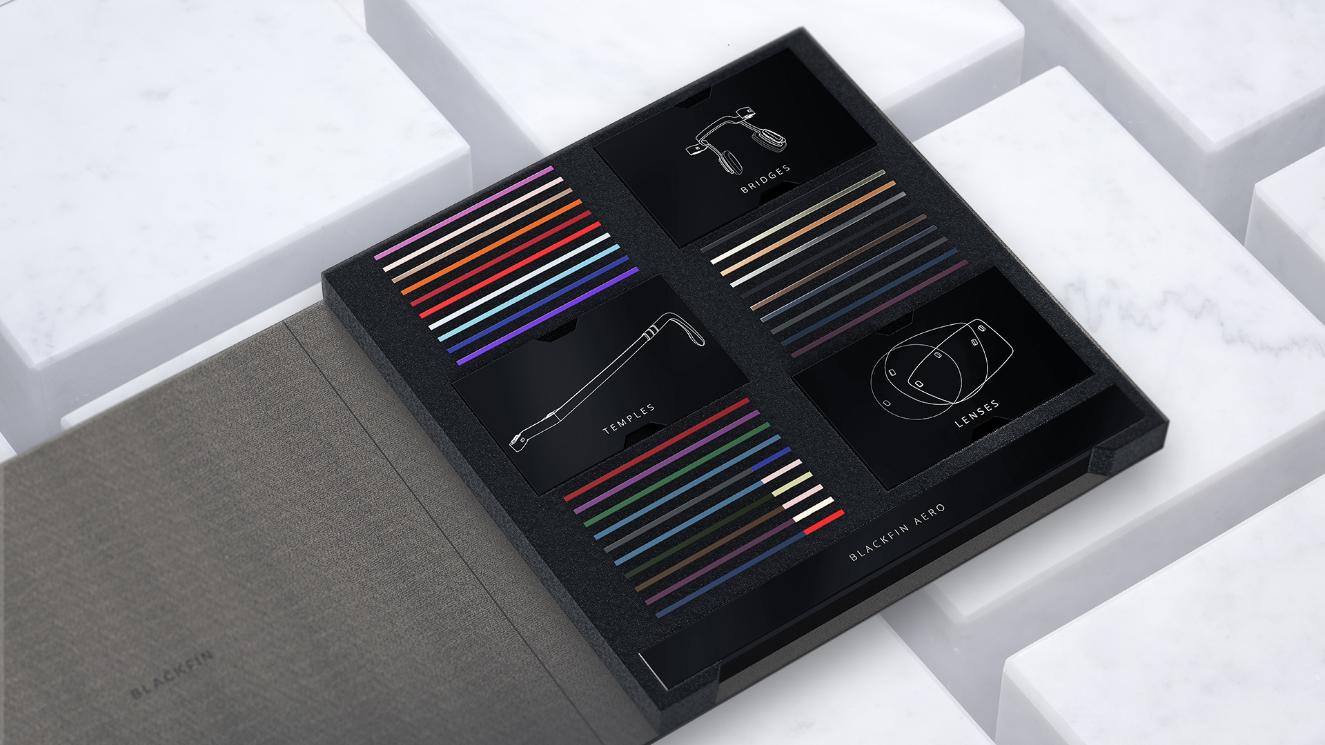 The updated Blackfin Aero series is currently being showcased at sales outlets in a special box that contains the various parts of the frame: 30 lens shapes, 2 different bridges – one geometric and one retro – each in 2 sizes, 2 temples of different lengths and 30 color options. With this new kit, opticians can now show the customer the entire collection in its many combinations, completely personalizing the buying experience.