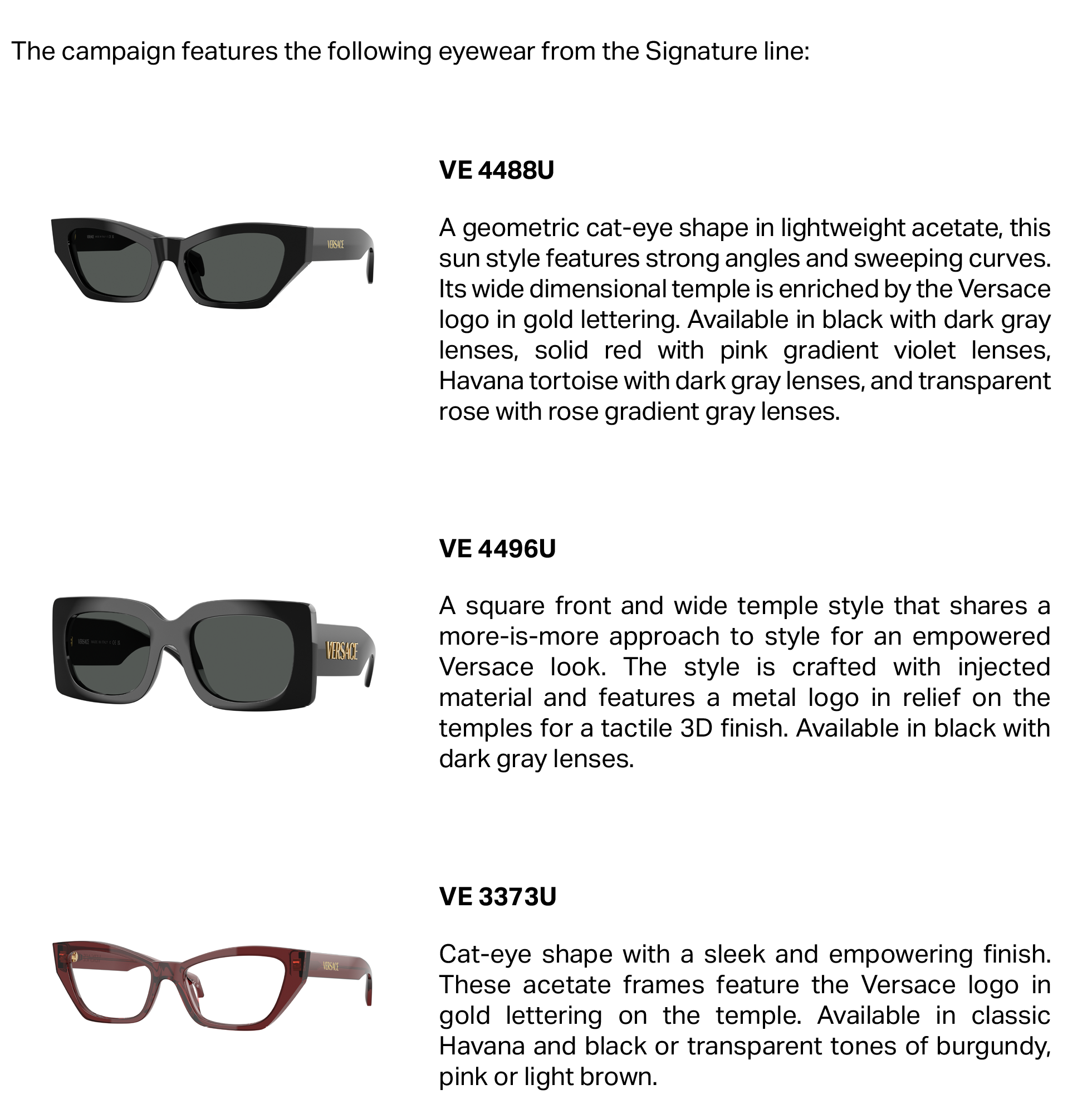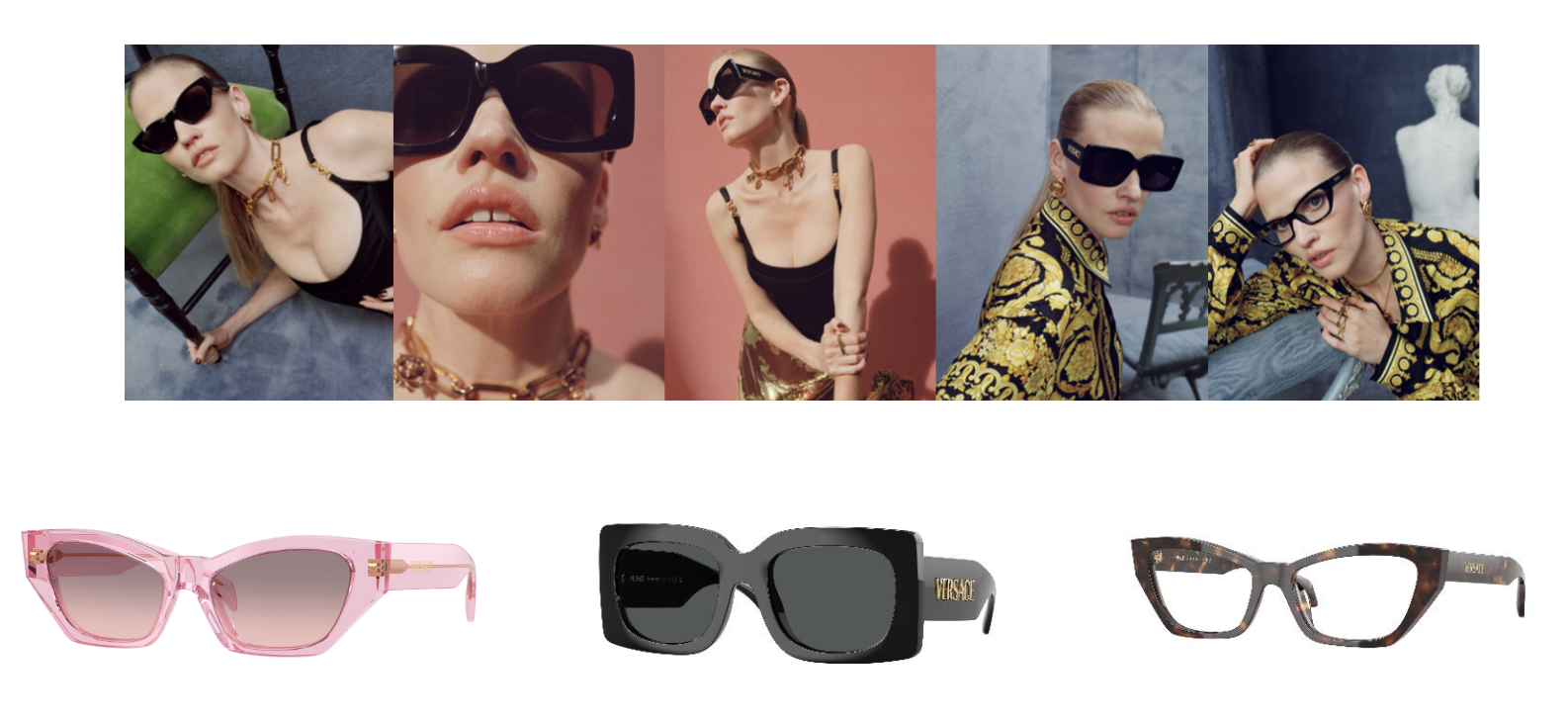 The campaign debuts the Signature line of new impactful eyewear styles defined by the Versace logo highlighted in gold along the temples. Signature includes a rich variety of acetate frames including geometric, cat eye and classic square shapes. Each has a sense of empowering impact, whether from a particularly sharp edge, exaggerated scale, or in the immediate feeling of iconic Versaceness it delivers. Campaign images from Los Angeles-based photographer Zoë Ghertner show yet another expression of Lara Stone as the Versace woman with individual spirit. Lara wears the season’s new eyewear styles and iconic Versace ready-to-wear including a bustier top with golden metal Medusa ’95 shoulder strap details, the season’s printed metal mesh skirt, and a silk shirt printed in the House’s definitive Barocco print.